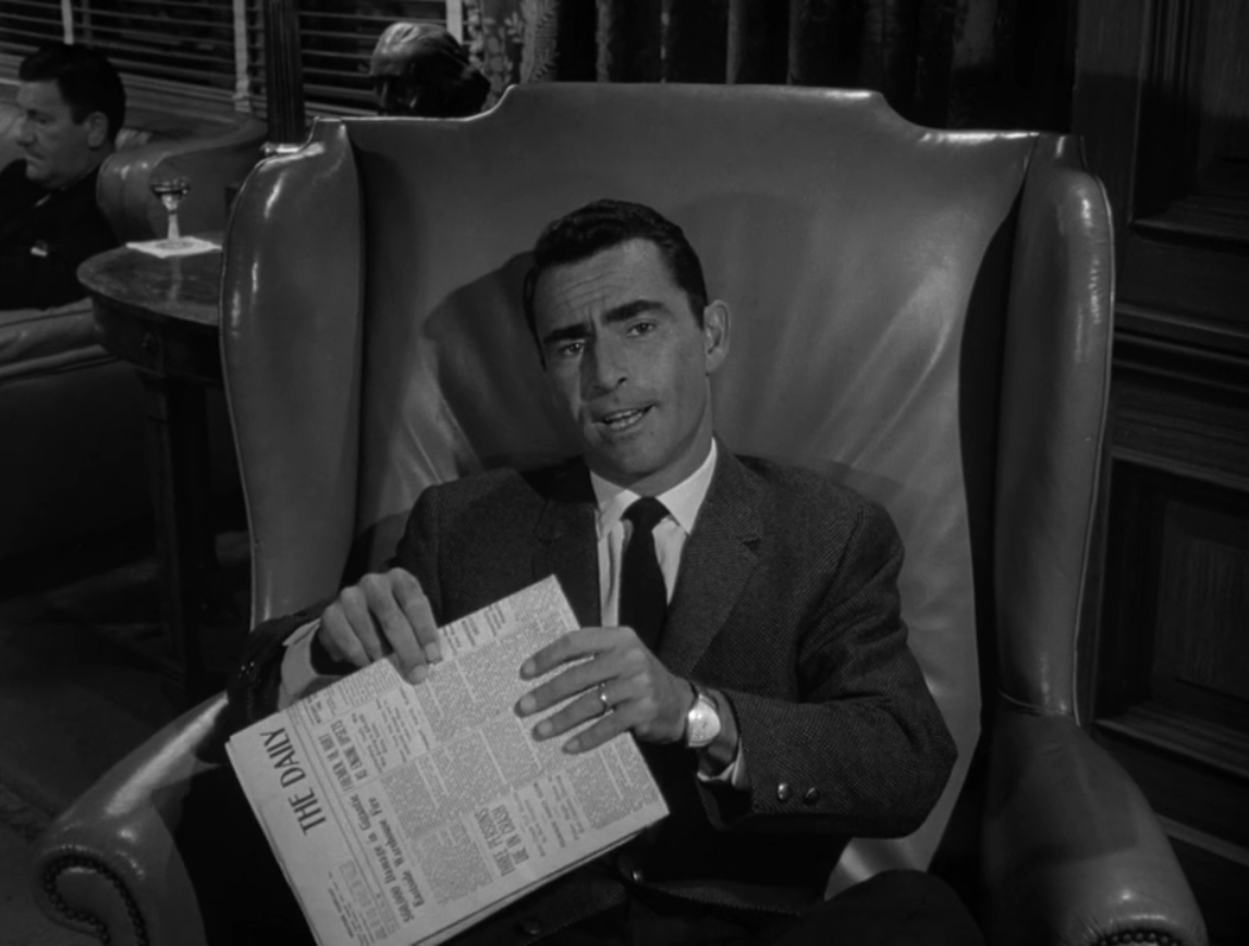 • When the camera pans over to Rod Serling as he gives the opening narration, he is seen seated in an armchair and reading a newspaper. The newspaper he is reading is “The Daily Journal,” a fictional prop newspaper. We’re all familiar with the TV and movie trope of a shot of a newspaper with a headline about a plot point in the drama. While this main story is often unique to a specific production, the same secondary articles can be found over and over again across many movies and shows. In Serling’s newspaper, some of the article titles include “Three Persons Die in Crash,” “Northside Hospital Building Fund Nears Goal with State Support,” “Bids Given on Bridge Project,” “Move to Ban Office Mergers is Begun,” “Fire Destroys State Aresnal, “$60,000 Damage in Gigantic Eastside Warehouse Fire,” and “Firemen, 18, Hurt as Engine Upsets.” If you image search any of these article titles, you will find their appearance not only in other Twilight Zone episodes but in many other shows and movies. For example, fictional newspapers containing the story “Northside Hospital Building Fund Nears Goal with State Support” can be found in movies like The Day the Earth Stood Still, Breakfast at Tiffany’s, and The Godfather.
