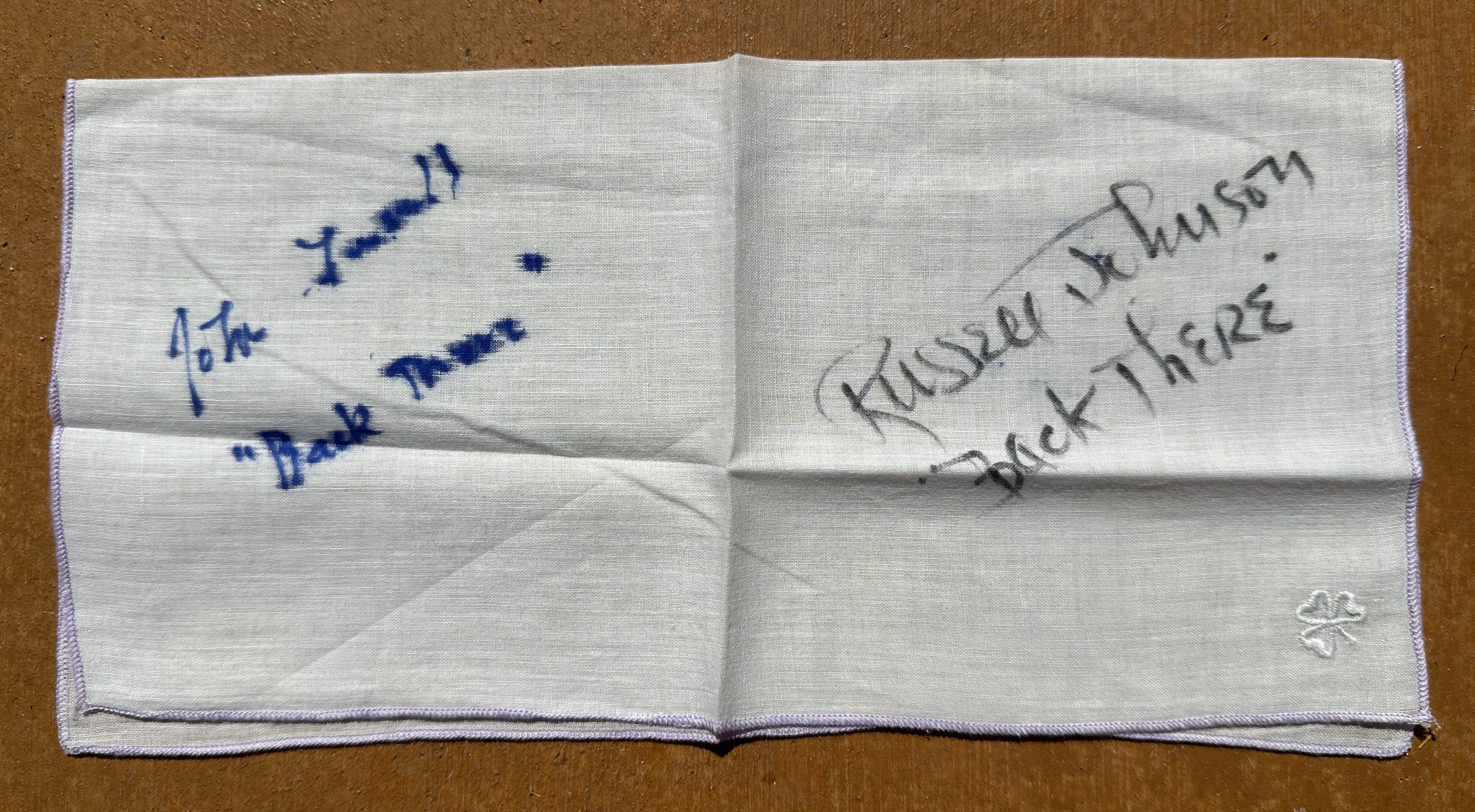 While my own handkerchief is missing the embroidered JWB in the corner, it does have the autographs of both John Lasell (JWB) and Russell Johnson (Peter Corrigan).
