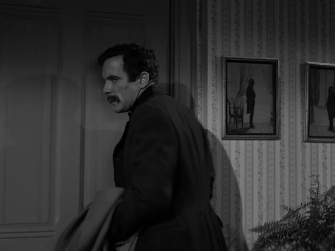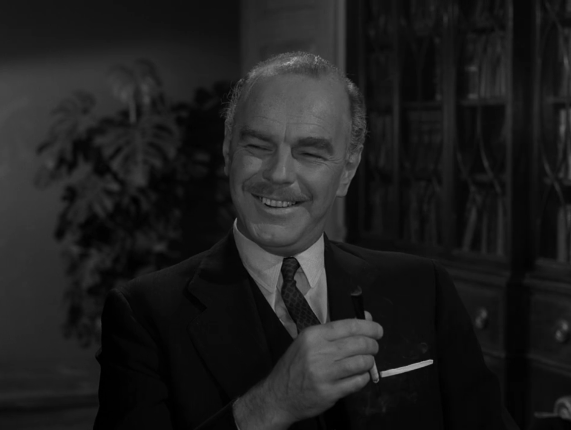 As a shocked and confused Corrigan walks out of the drawing room with his historic handkerchief in hand, Rod Serling’s voice provides the closing narration.