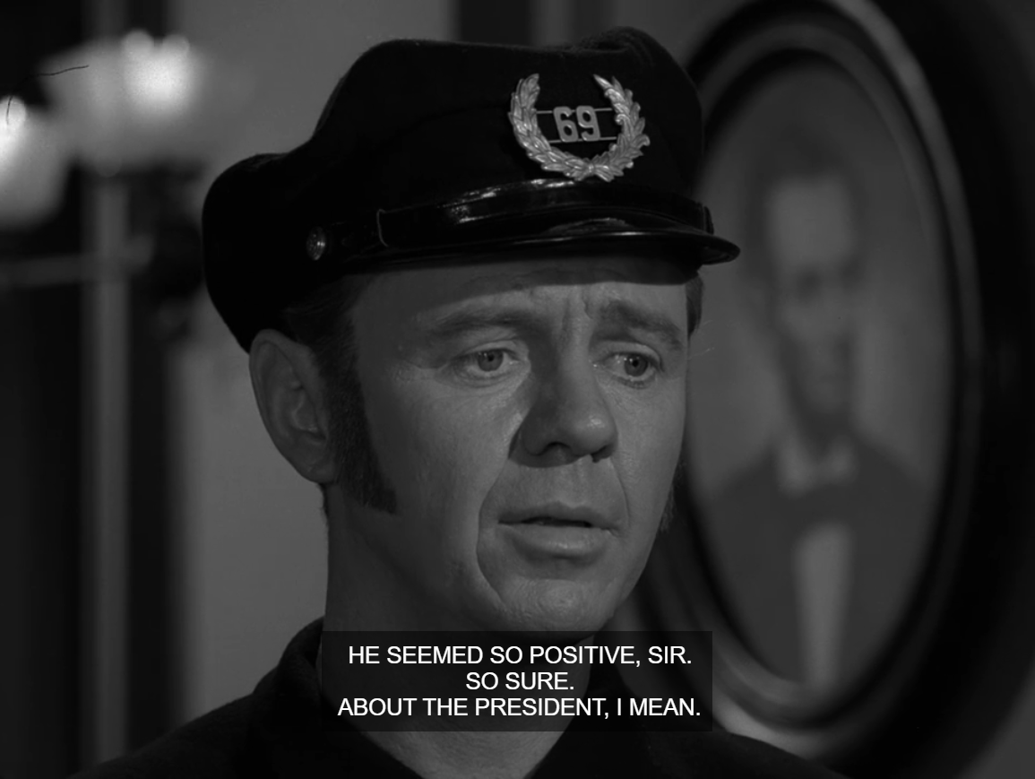 However, just then, voices are heard from the street outside. Mournful voices proclaim that “The President’s been shot” and that “an actor shot Lincoln.” We cut to a gathered crowd mumbling over the news. Back inside the room, the occupants fall into a state of grief and shock. The chambermaid weeps into her hands. Corrigan collapses dejectedly back down onto the sofa. The patrolman removes his hat and mutters to himself, “You did know. Oh, my dear God,” before he and the chambermaid leave the room. A defeated Corrigan stands and walks to the window of the room. With righteous anger, he proclaims, “I tried to tell you. I tried to warn you. Why didn’t you listen?” He repeats his rhetorical cry, “Why didn’t you listen to me?” while banging on the window. Then suddenly, the shot shows Corrigan, back in his 1961 garb, banging on the door of the Potomac Club instead.
