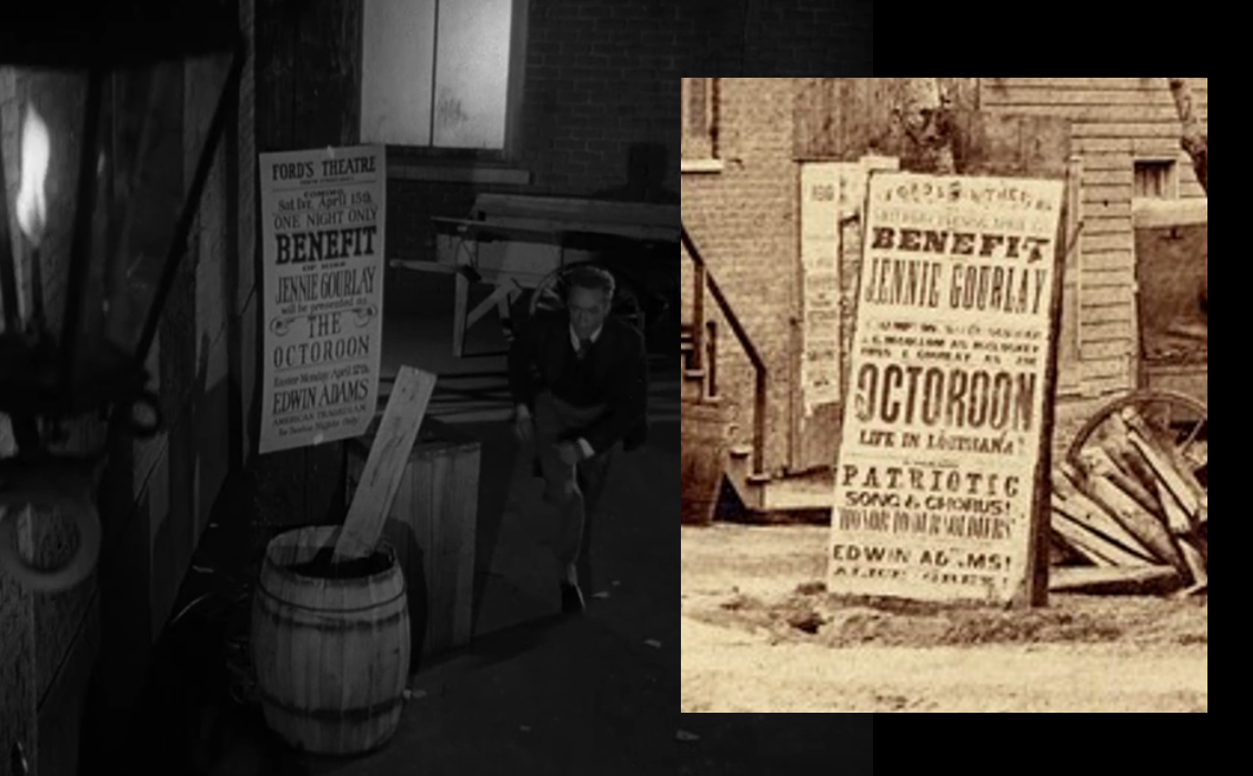• In the scene where Corrigan is shown running up Baptist Alley and pounding on the stage door of Ford’s Theatre, two large broadsides are shown. One of them is a mock-up of a broadside announcing that night’s performance of Our American Cousin. It is similar in style to a modified Ford’s Theatre playbill and, as far as props go, is well done. The other broadside, only seen as Corrigan runs up, is not a duplicate of the Our American Cousin poster but an advertisement for the next night’s show of The Octoroon. After the assassination of Lincoln, this performance did not go on, but the Ford brothers had commissioned the making of a broadside announcing the performance. In a picture taken of Ford’s Theatre draped in mourning shortly after the assassination, the broadside for The Octoroon can be seen posted on the side of the street near the theater.