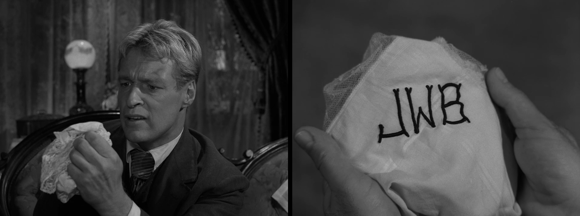 The patrolman helps Corrigan back to the sofa, and Corrigan recalls how Lincoln was shot from behind and the assassin jumped from the box to the stage and out into the wings. The patrolman says, “You’re telling me this as though it’s already happened.” Corrigan, desperate to stop the tragedy and no longer worried if this man will think him crazy, replies, “It has happened. It happened a hundred years ago, and I’m here to see that it doesn’t happen.” Corrigan then asks the chambermaid where Wellington is. The chambermaid replies that there is no one here by that name. Corrigan dismisses this remark and insists on the location of Wellington, the man who brought him there and lives in this room. The chambermaid replies again that no one named Wellington resides in this place. Exasperated, Corrigan raises his fist to shake it at the chambermaid when he sees he is still holding the handkerchief Wellington gave him. He opens up the handkerchief to reveal the stitched initials “JWB.”