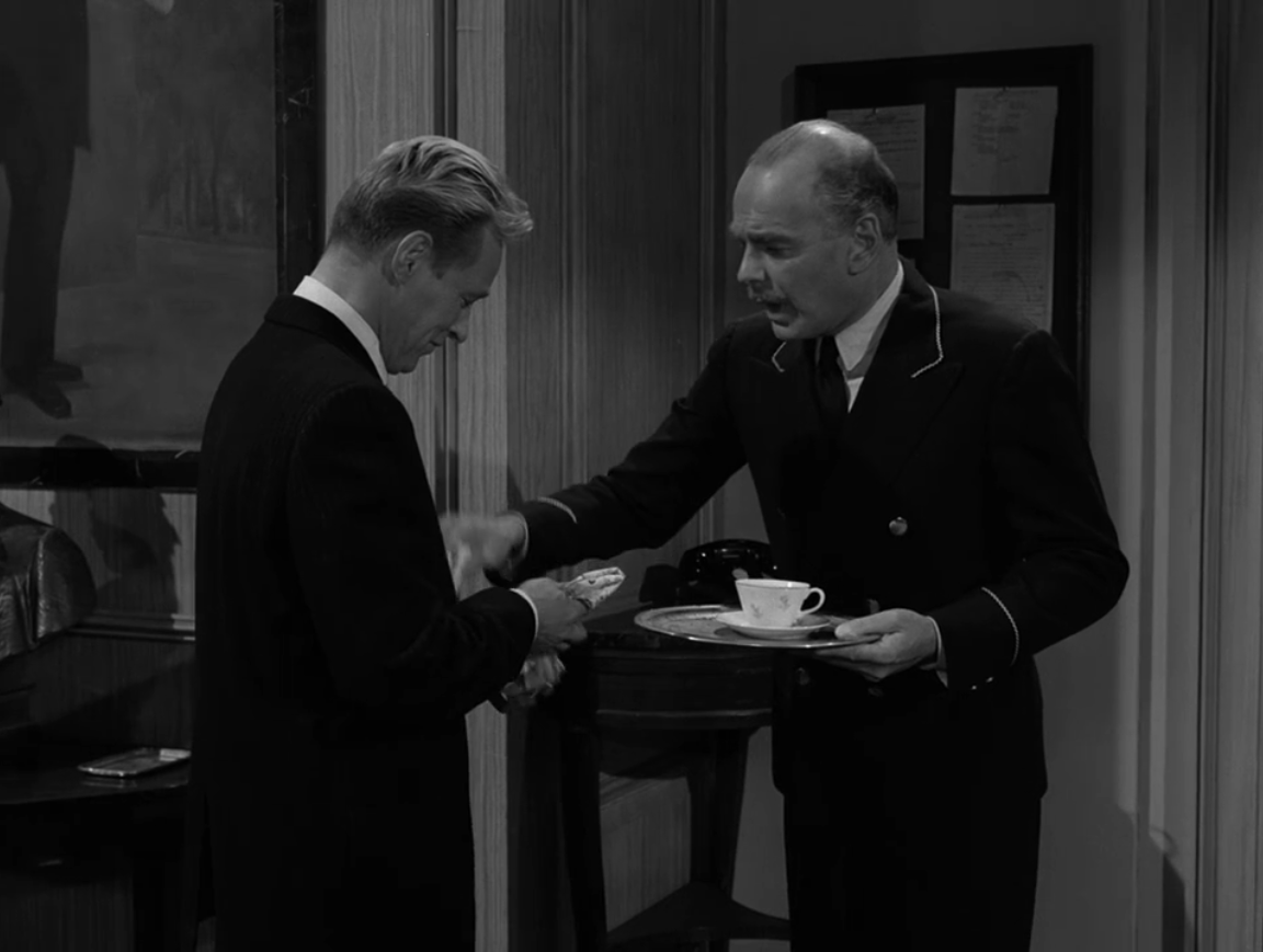 In volume 10 of the series, As Timeless as Infinity: The Complete Twilight Zone Scripts of Rod Serling, edited by Tony Albarella, a working script for “Back There” dated July 28, 1960, can be found. This script differs somewhat from the final shooting version of the script that was finalized on September 14. Some of the changes in the script are small, like “The Potomac Club” originally being called “The Washington Club” and the fact that the script has Corrigan gaining a hat when he appears in the past. There are also a few extra lines here and there, and altered versions of other lines. The largest change from the July script and what was eventually shot was the introductory scene between Corrigan and William. In this earlier version, William does not spill any coffee on Corrigan. Instead, their interaction goes like this: