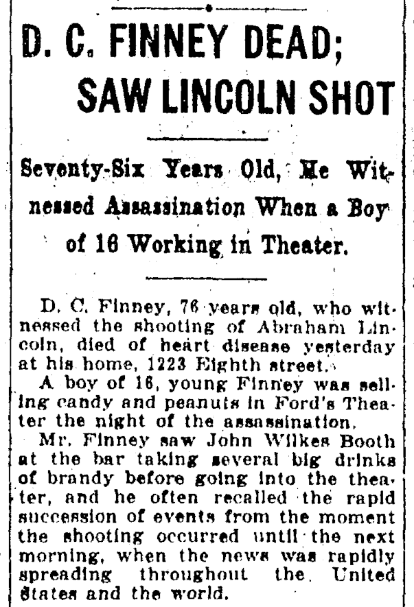 In this way, we know that Frank Drake acted as a sort of gumdrop and peanut boy at Ford’s Theatre. But he had left D.C. with his father shortly before the assassination, so we know he’s not our Peanut John. While in his statement to Cook, David Finney makes it seem like only Frank Drake was involved in the gumdrop trade, when Finney died in 1925, his obituaries noted that he also sold “candy and peanuts in Ford’s Theatre.” Moreover, these obituaries state that Finney was selling concessions the night Lincoln was killed and witnessed the events. In addition, one of Dr. Drake’s other sons, Albert, also told his father about the goings on at the theater, making it likely that there was a small cadre of boys who hung around the theater and made extra money selling gumdrops and peanuts.