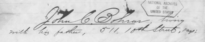 On the statement where Peanut’s name is given as “John C. Bohrar” it states that he is “living with his father.” At the time of Lincoln’s assassination, John Bohrer’s parents were divorced and living in different states. His mother, Margaret Bollinger, resided in Kansas while his father, Benjamin Rush Bohrer, was living in Georgetown.