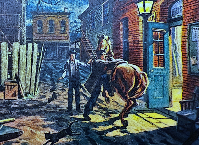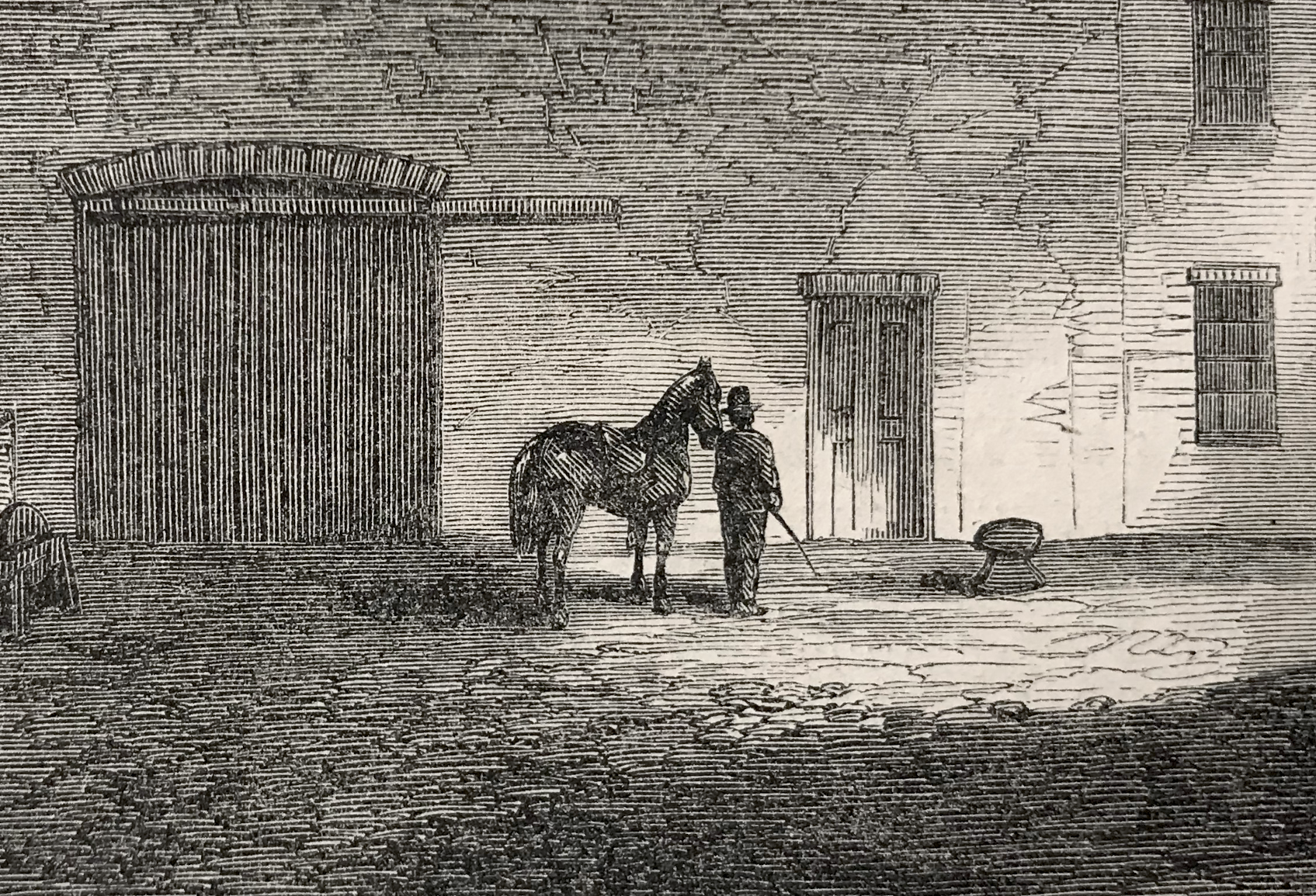 It’s worth pointing out that the stage door that Peanuts was tasked with guarding during performances is not the back door through which John Wilkes Booth entered. Rather, his place was located stage left on the south side of the building. A covered alleyway of sorts ran from Tenth Street all the way to the rear of Ford’s Theatre into Baptist Alley. This walkway separated Ford’s Theatre proper from the Star Saloon located just to the south. A side door of the Star Saloon led directly into this passageway, and it appears the Fords may have had an issue with bar patrons mistakenly opening the door directly onto the stage during performances. Therefore, Peanut John guarded this door, preventing anyone from accidentally interrupting a performance. When Peanuts was called by Edman Spangler, he abandoned his normal post to hold Booth’s horse directly behind Ford’s Theatre.