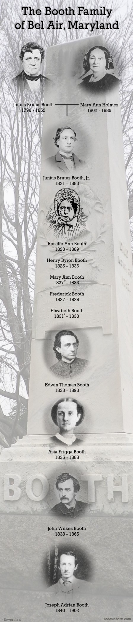 Booth Family – I read somewhere that in the Booth Family plot that John Wilkes Booth is buried under the two younger siblings – 1 year old Frederick and 2 year old Elizabeth. This was done under instructions from Edwin Booth with the idea that JWB’s remains would not be disturbed.