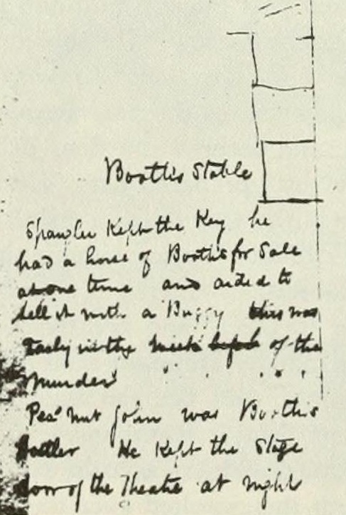 Note written by John Ford while in prison about Booth’s stable out back of Ford’s Theatre. It states, “Spangler kept the key. He had a horse of Booth’s for sale at one time and aided to sell it with a buggy this was early in the week before of the murder.