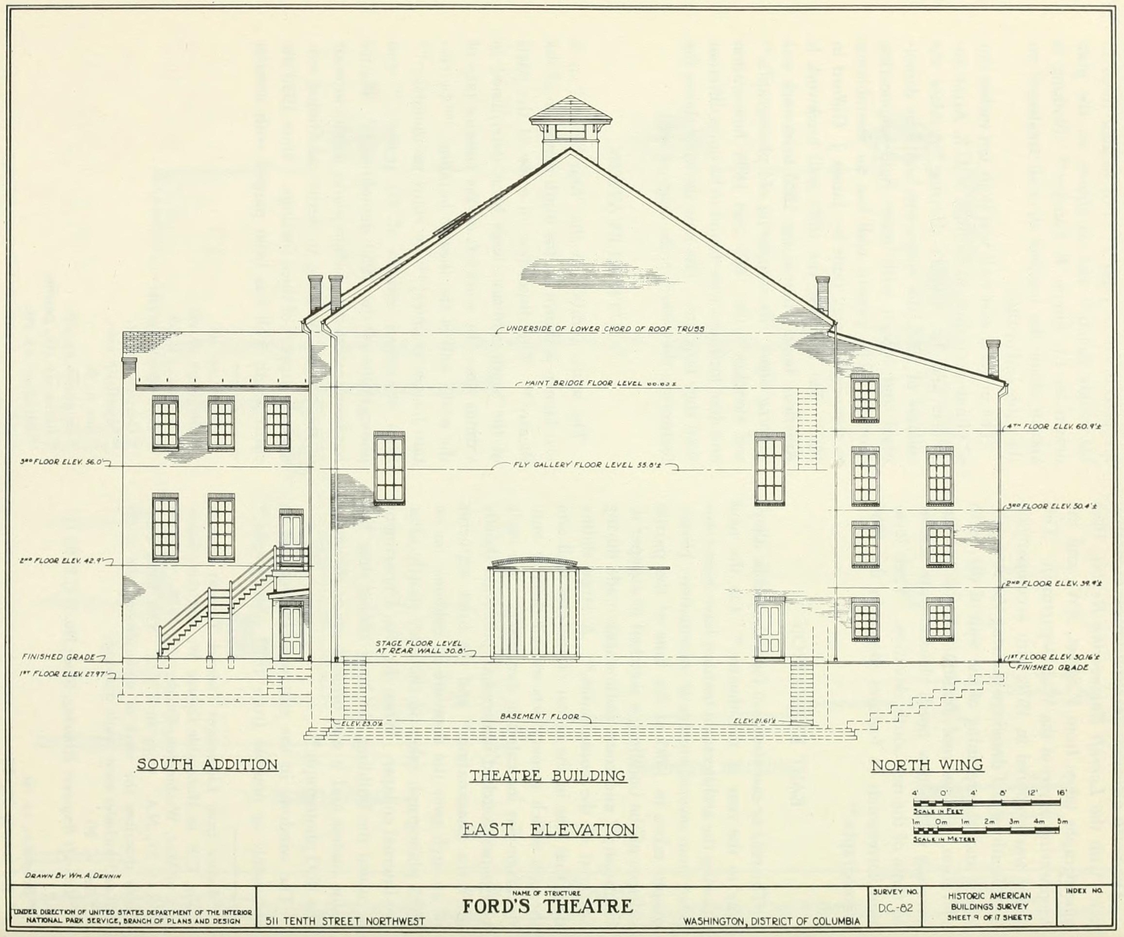 Plan of Ford’s Theatre showing the rear wall and doors through which Booth escaped onto Baptist Alley. Image Source: Restoration of Ford’s Theatre