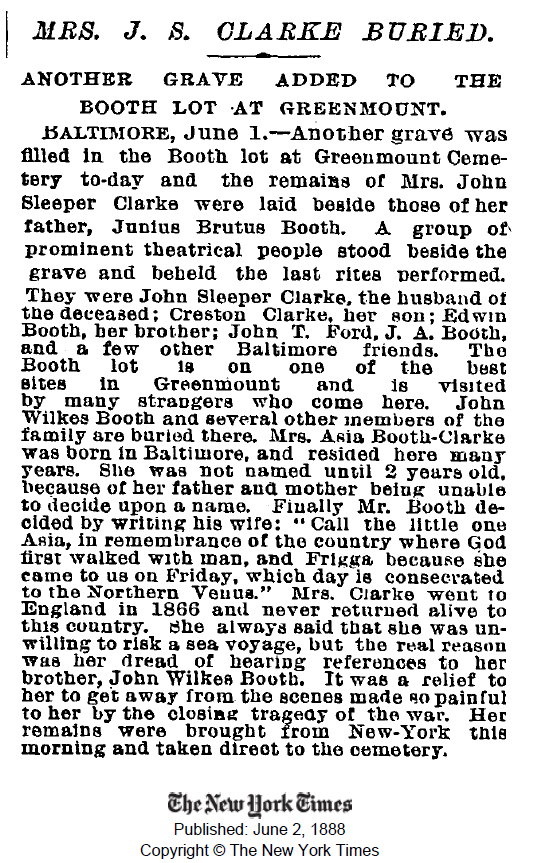 An obituary discussing the funeral of Asia Booth. Image Source: New York Times