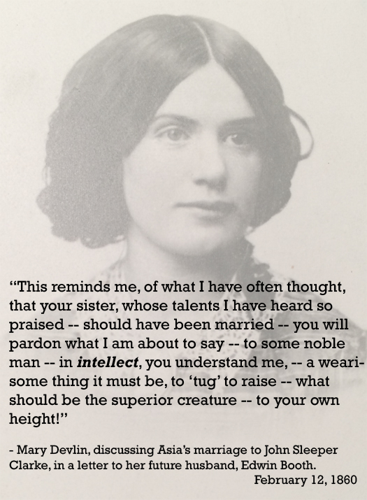 Mary Devlin’s opinion of Asia’s marriage to John Sleeper Clarke. Text Source: The Letters and Notebooks of Mary Devlin Booth by L. Terry Oggel