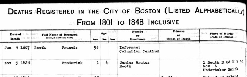 Death record for Frederick Booth, showing that he died in Boston on November 5, 1828. Image Source: Ancestry.com