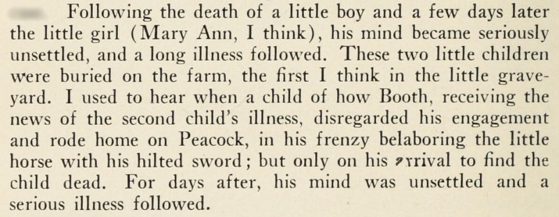 An account of Junius Brutus Booth’s reaction to the death of his young children. Image Source: Sketches of Tudor Hall by Ella Mahoney