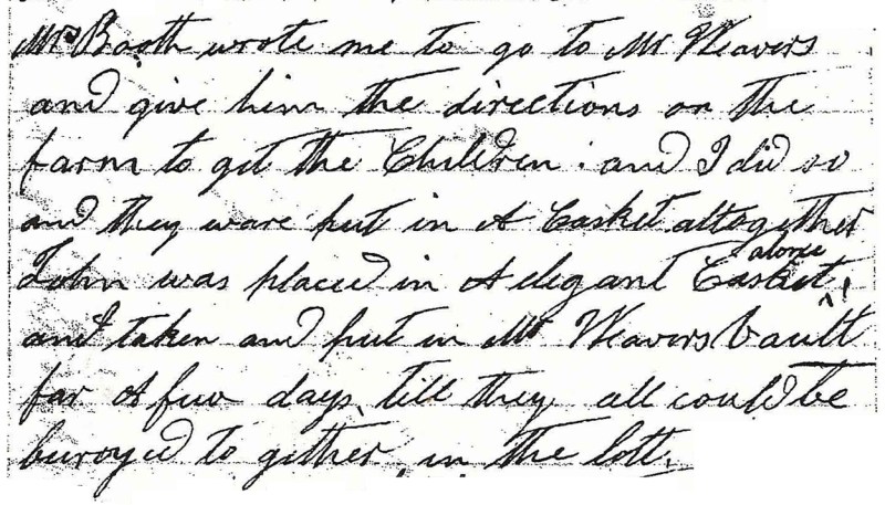 Part of a letter written by Mrs. Rogers, a former neighbor of the Booth family. She recounts assistng the Booth family in transferring the bodies of Frederick, Elizabeth and Mary Ann from their family cemetery at Tudor Hall to the plot at Green Mount Cemetery.
