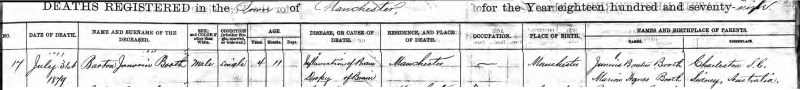 The death record for Junius Brutus Booth, Jr. and Agnes Booth’s son Barton J. Booth. Image Source: Ancestry.com