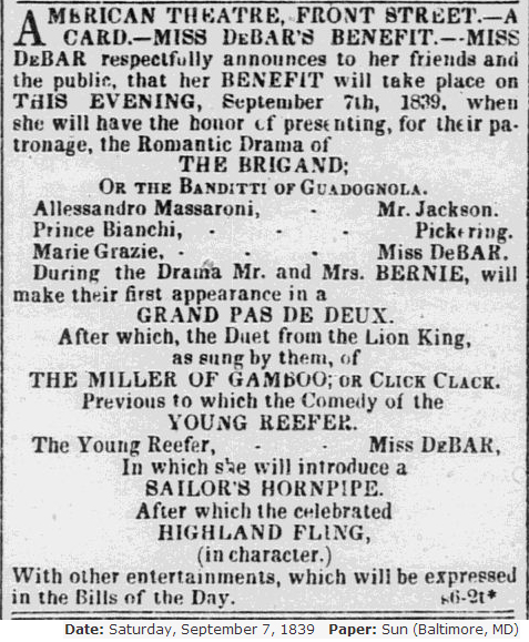 Benefit performance for Clementina DeBar, Junius Brutus Booth, Jr.’s first wife. Image Source: GenealogyBank.com