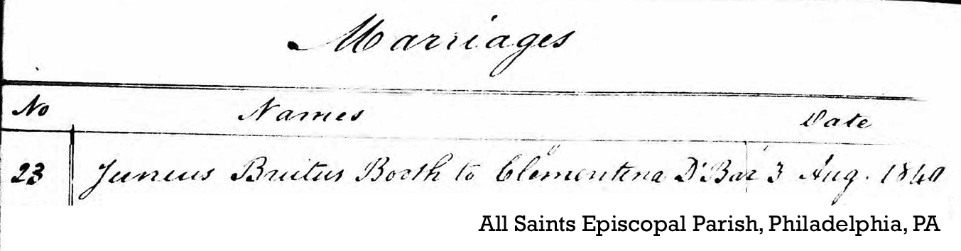 Marriage record for Clementina DeBar and Junius Brutus Booth, Jr. Image Source: Ancestry.com