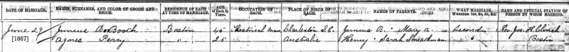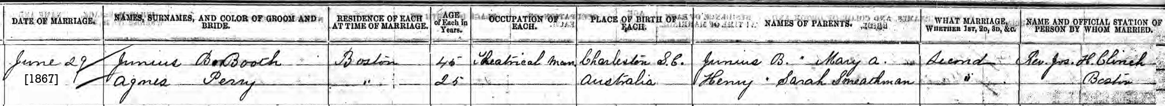 Marriage record of Junius Brutus Booth, Jr. to Agnes Perry. Image Source: Ancestry.com