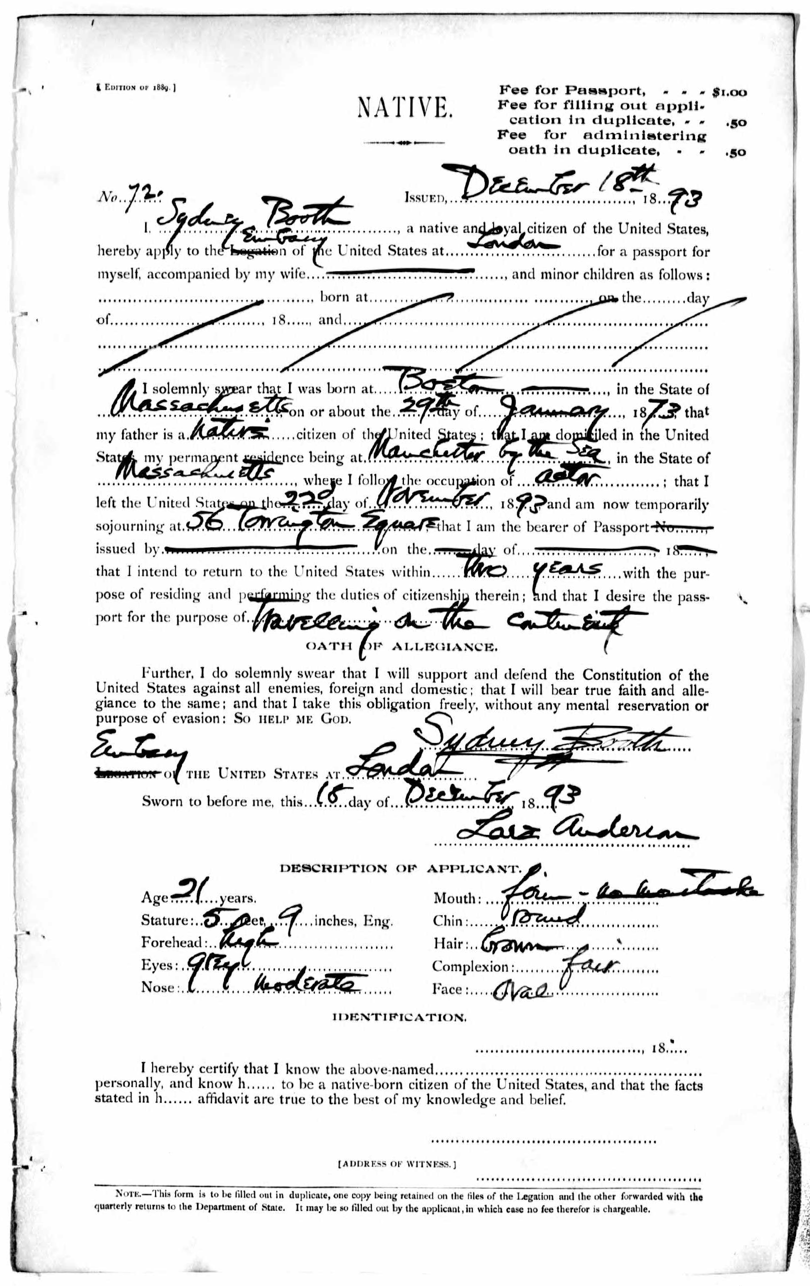 Passport application of Sydney Barton Booth, the son of Junius Brutus Booth, Jr. Image Source: Ancestry.com