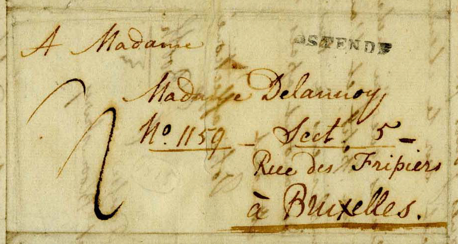 Cover of a letter written by Junius Brutus Booth to Mrs. Delannoy, the mother of his first wife Adelaide. Simliar to his later elopement with Mary Ann Holmes, Junius ran off with Adelaide against her mother’s wishes and married her in England. The see the full letter (in French) go here: https://lincolnconspirators.com/wp-content/uploads/2014/06/junius-letter-to-madam-delannoy-taper-alplm.pdf
