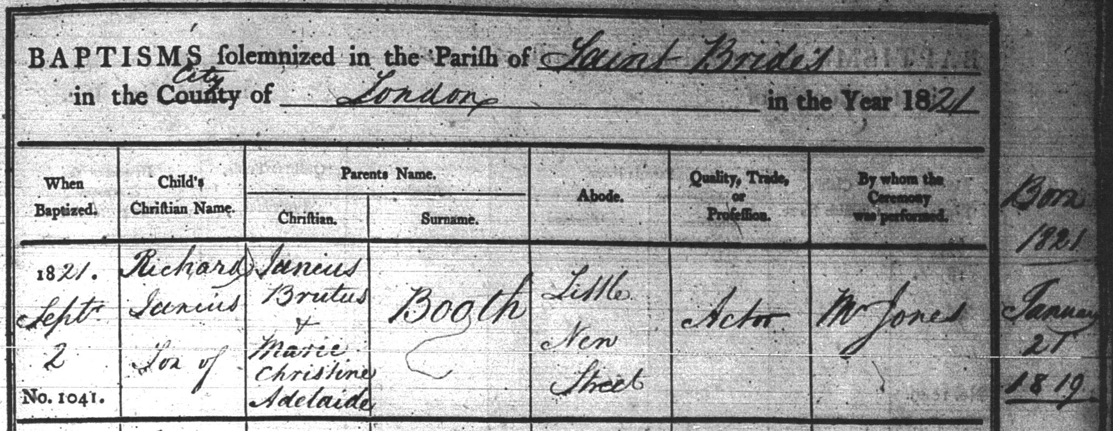 Richard Junius Booth was the son of Junius Brutus Booth and his first wife Adelaide. When Richard was older and came to America he discovered that Junius had a second “wife” and children. He informed his mother who then moved to Baltimore, made life a living hell for Mary Ann and her children and eventually divorced Junius.