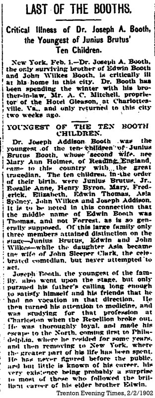 Dr. Joseph Adrian Booth died on February 26, 1902 at the age of 62. This newspaper article, reporting on his final illness provides a brief biography.