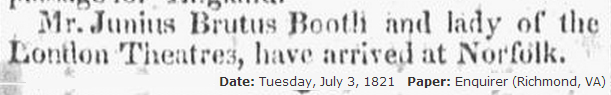 This newspaper article notes the arrival of Junius Brutus Booth and Mary Ann Holmes to America on June 30, 1821. Image Source: GenealogyBank.com