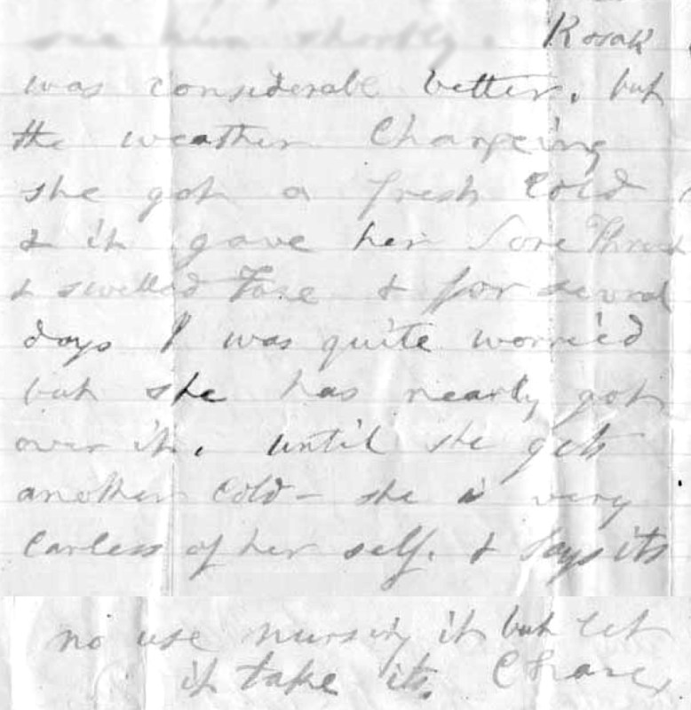In a letter written by Mary Ann Booth to her granddaughter Edwina, Mrs. Booth mentions Rose’s ongoing ill health.