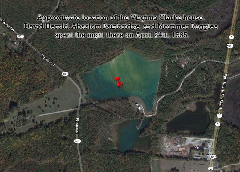Aerial map showing the approximate location of Mrs. Virginia Clarke’s home in Caroline County. Created by Dave Taylor