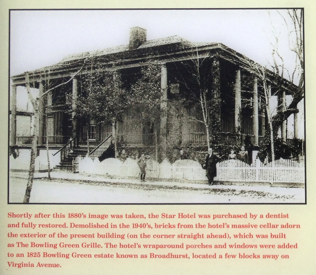 After dropping Booth off at the Garrett farm, Willie Jett proceeded to this, the Star Hotel, in Bowling Green. Jett was courting the hotel proprietor’s daughter, Izora Gouldman, Jett was discovered here by union troops on the night of April 25th, and forced to reveal Booth’s location. The original hotel no longer stands.