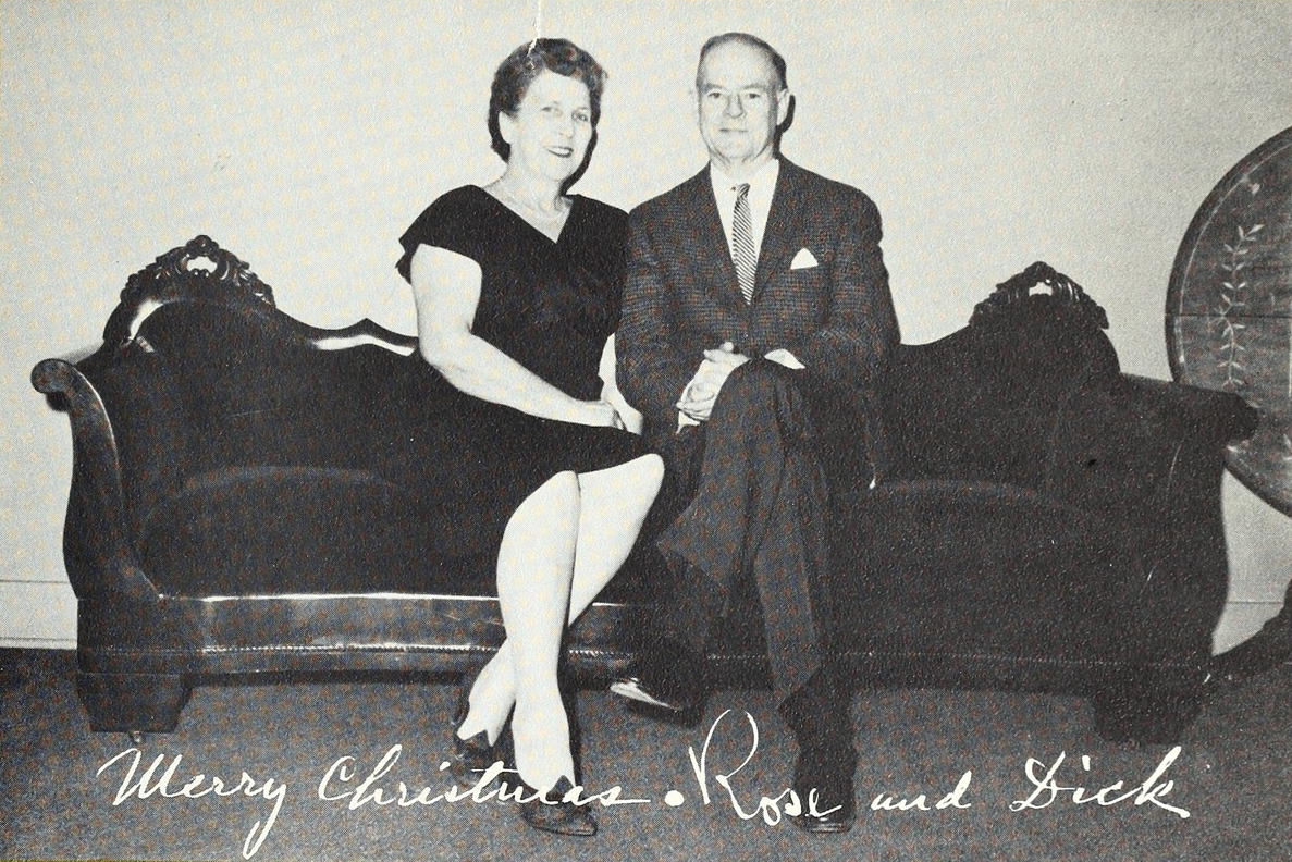 Dr. Richard Mudd, Dr. Samuel Mudd’s grandson, and his wife seated on the Booth sofa which is now held in the Dr. Mudd House.
