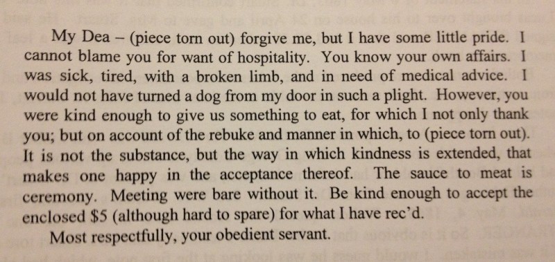 Transcript of Booth’s first poison pen thank you note to Dr. Stuart. Unhappy with the less than hospitable welcome he received from Dr. Stuart, Booth wrote this note and added insult to injury by offering to pay for the meal. He decided to insult Dr. Stuart further by decreasing the amount to $2.50 and drafting a new note. He took this first one and shoved it into a pocket of his diary. The original torn diary page was lost after the John Surratt, Jr. trial.