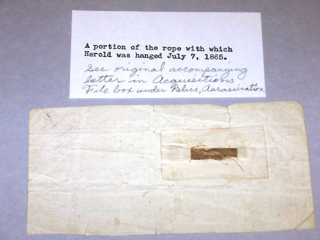 Piece of rope said to have been from the one used to hang David Herold. Image Source: Lincoln Foundation