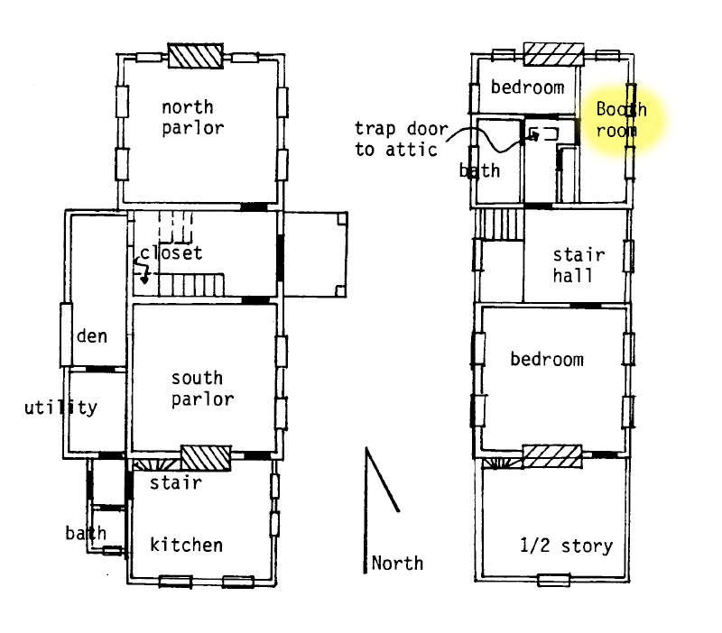 Floor plan of the Horsehead Tavern. Notice the highlighted “Booth Room” where John Wilkes Booth is said to have stayed the night in the fall of 1864. Image Source: Maryland Historical Trust