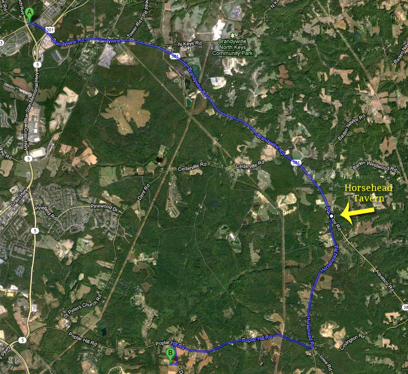 Map of the modern route between TB (A) and Dr. Mudd’s house (B) by way of Horsehead Tavern. Image Source: Google Maps