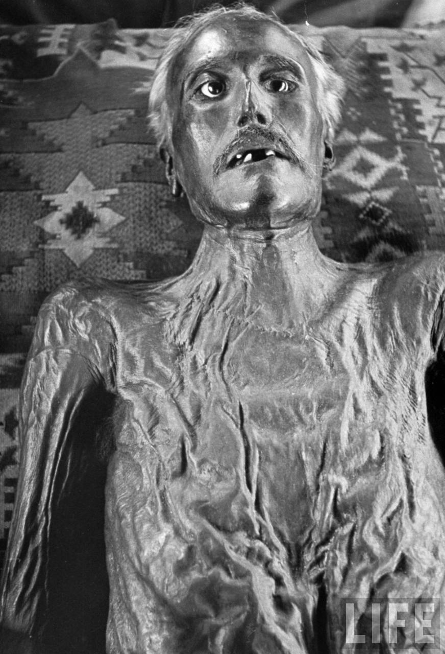 The mummy of David E. George, claimed to be that of an escaped John Wilkes Booth, on display at a carnival sideshow in 1937.