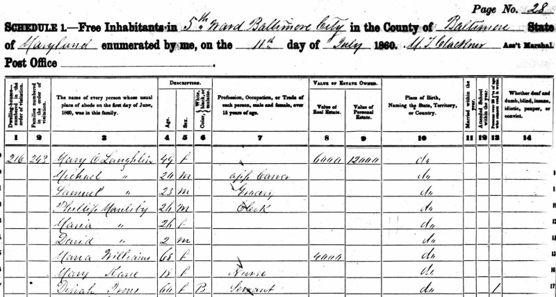 The 1860 Federal Census showing conspirator Michael O’Laughlen and his family. Image Source: Ancestry.com
