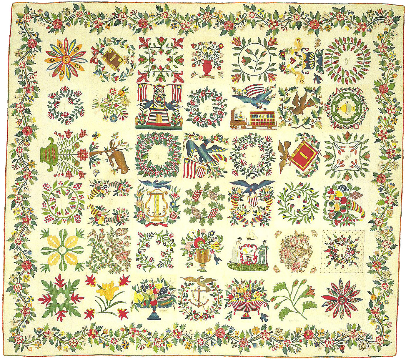 The Samuel Williams Quilt containing applique squares by Michael O’Laughlen and his family members. Image Source: Dave Taylor See here: http://boothiebarn.com/2012/05/06/michael-olaughlen-quilter/