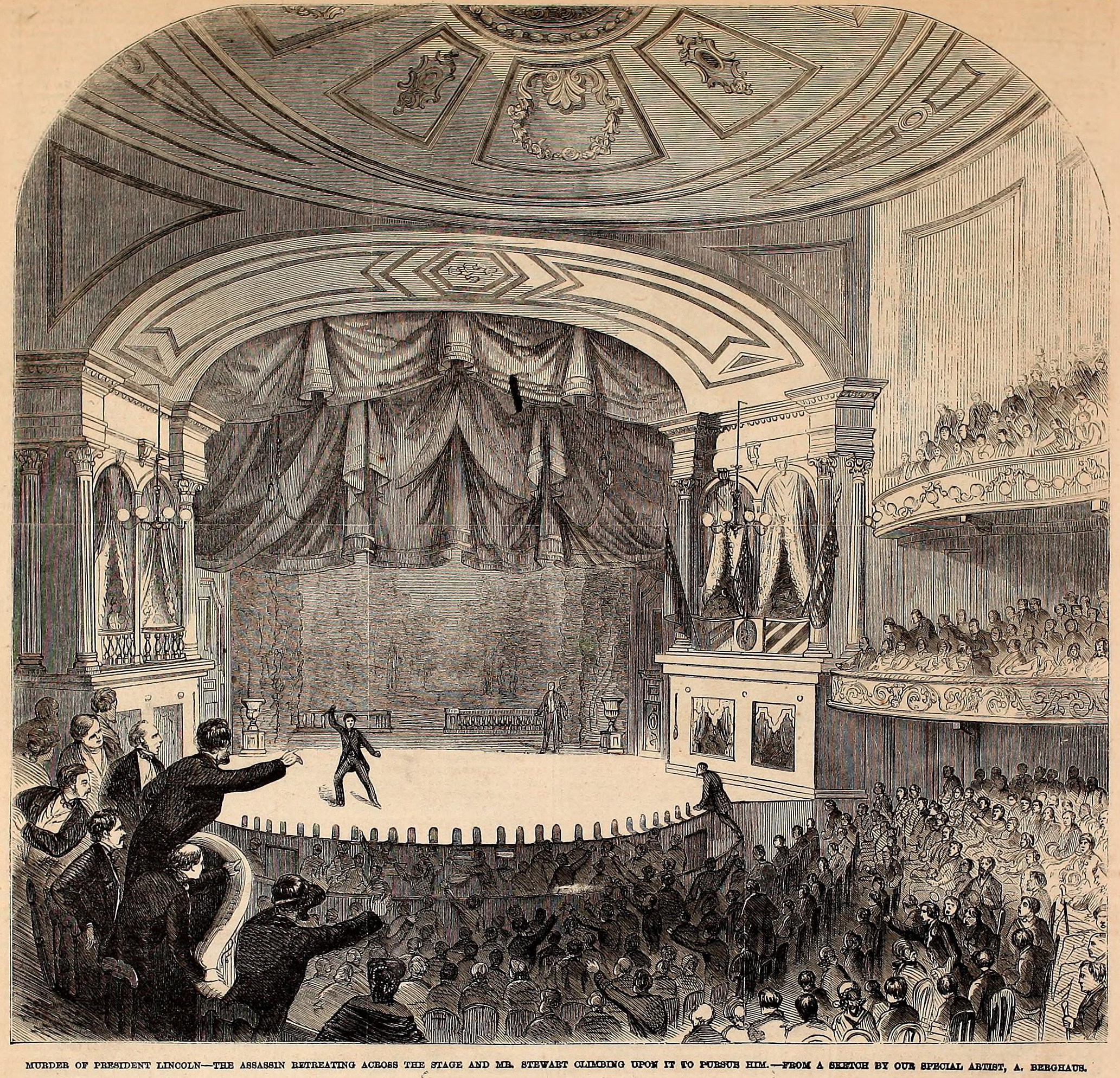 A drawing of John Wilkes Booth on the stage of Ford’s Theatre after assassinating President Lincoln. Image Source: Frank Leslie’s