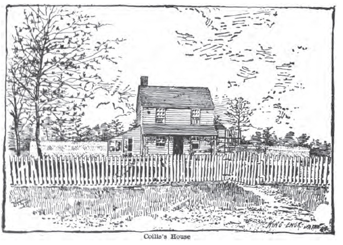 Engraving of the Collis house in Thomas Jones’ book. According to Jones, he first met Booth and Herold in the Pine Thicket where a man named Edward Collis later made this house. Image Source: Thomas Jones