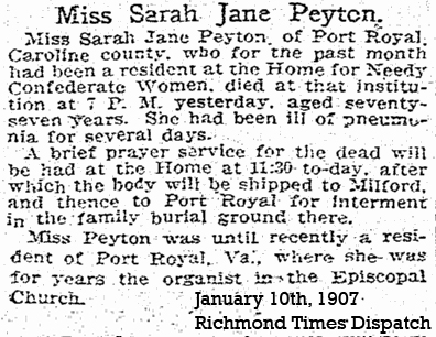 The obituary for Sarah Jane Peyton, the lady who turned Booth and Herold away from her home in Port Royal. Image Source: Richmond Times Dispatch