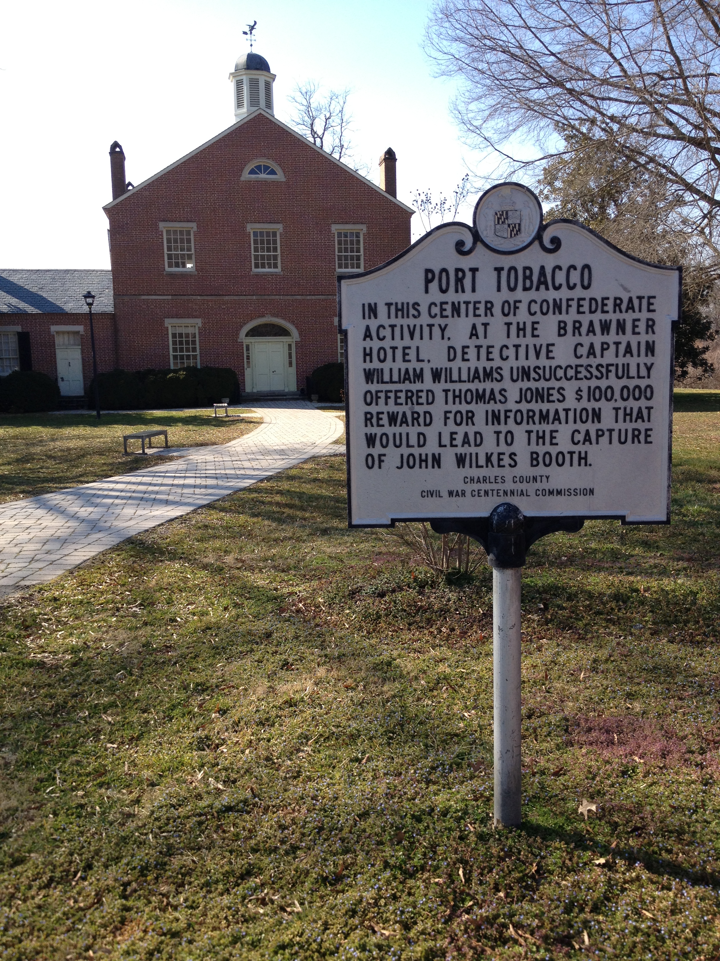 The historical marker in Port Tobacco with the reconstructed courthouse in the background. Image Source: February 2013
