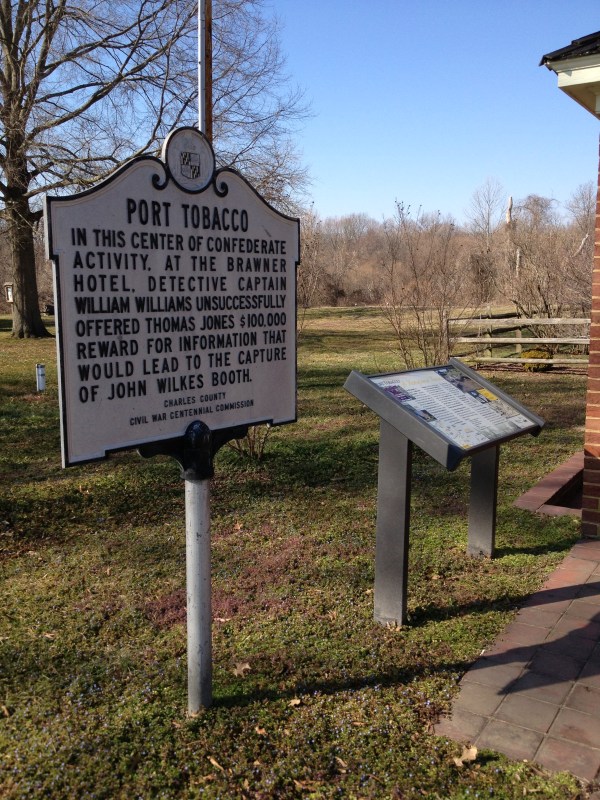 Two signs in Port Tobacco, Maryland with the site of the former Brawner Hotel in the background. Image Source: Dave Taylor February 2013