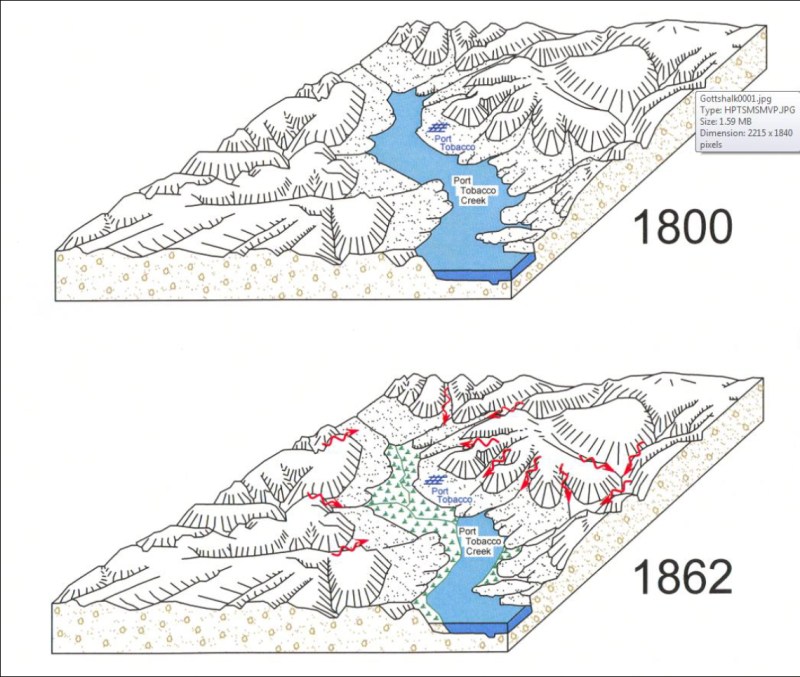 Diagram showing the silting that occurred to the Port Tobacco River which ultimately ruined the town. Image Source: Port Tobacco Preserve America Report