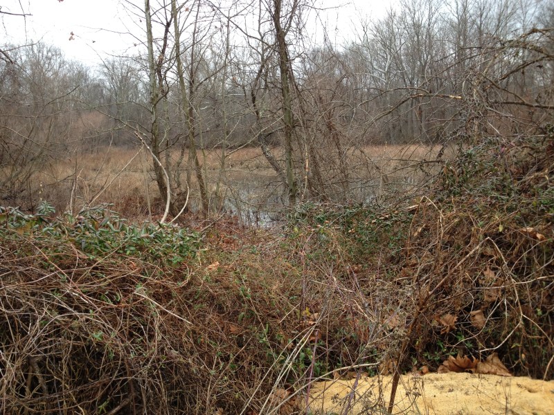 The swamp behind the Port Tobacco Courthouse. The Port Tobacco River once flowed through here before it became silted up. Image Source; Dave Taylor December 2012