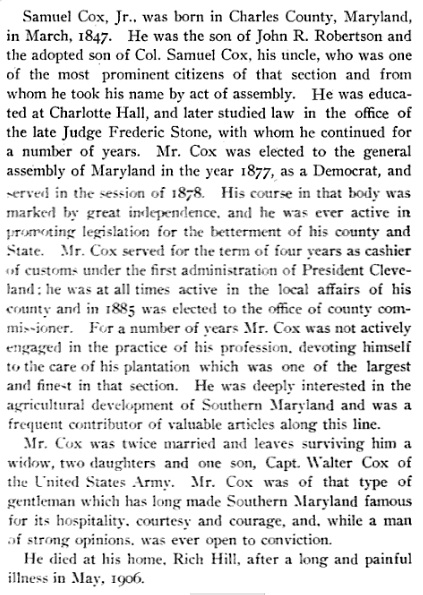 A short biography of Samuel Cox, Jr, from the book, “The Annual Report of the Maryland State Bar Association” (1907).