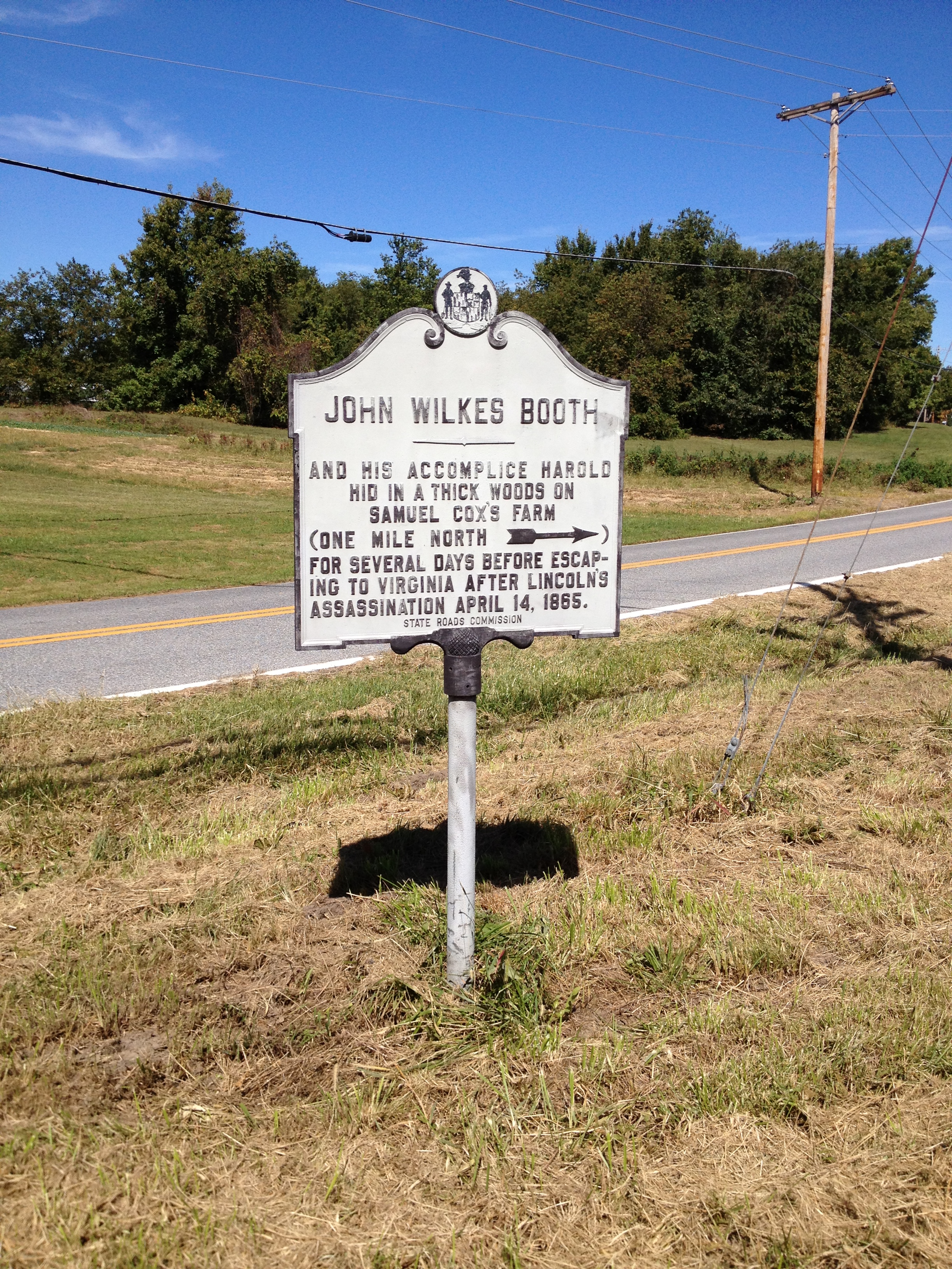 A slightly erroneous highway sign near the pine thicket where Booth and Herold hid. A mile from this sign is Rich Hill farm, as stated, but it was not on Cox’s land that the pair hid. Image Source: Dave Taylor Sept. 2012