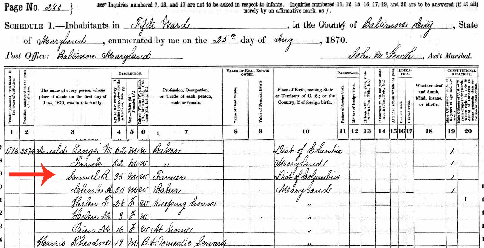 1870 census records for the Arnold family, showing Samuel’s return from Fort Jefferson. Image Source: Ancestry.com