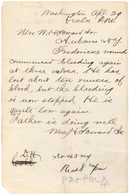 Telegram letter written by William H. Seward, Jr. to his wife back in New York reporting on his father and brother’s conditions. Image Source: Heritage Auctions