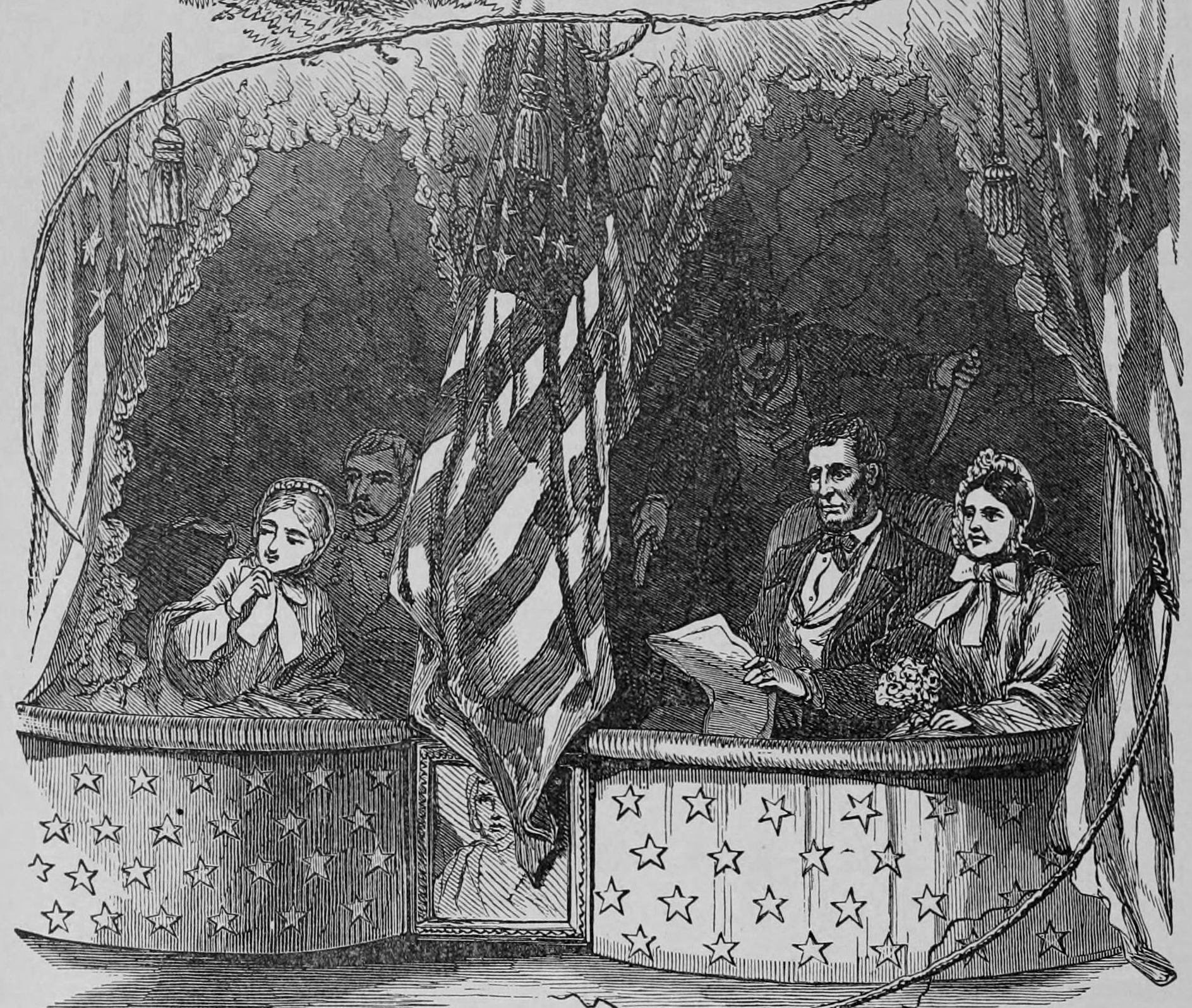Drawing of John Wilkes Booth sneaking up on President Lincoln in his box at Ford’s Theatre. Image Source: Archive.org